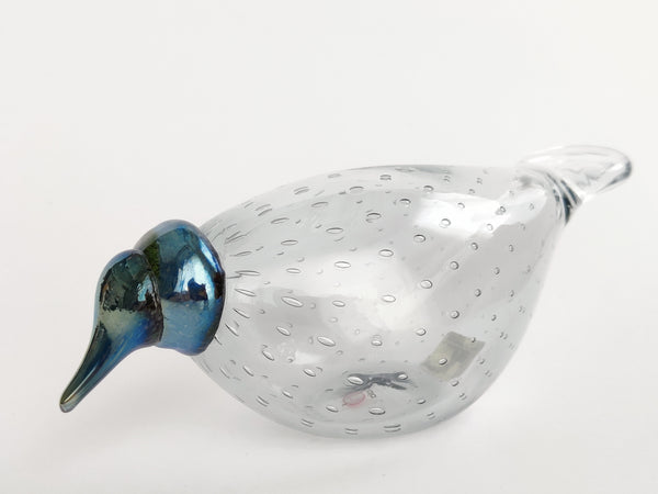 This Helmi bird was introduced in 2015. It is a bird in clear grey glass with controlled bubbles. The head and beak are lustered blue.